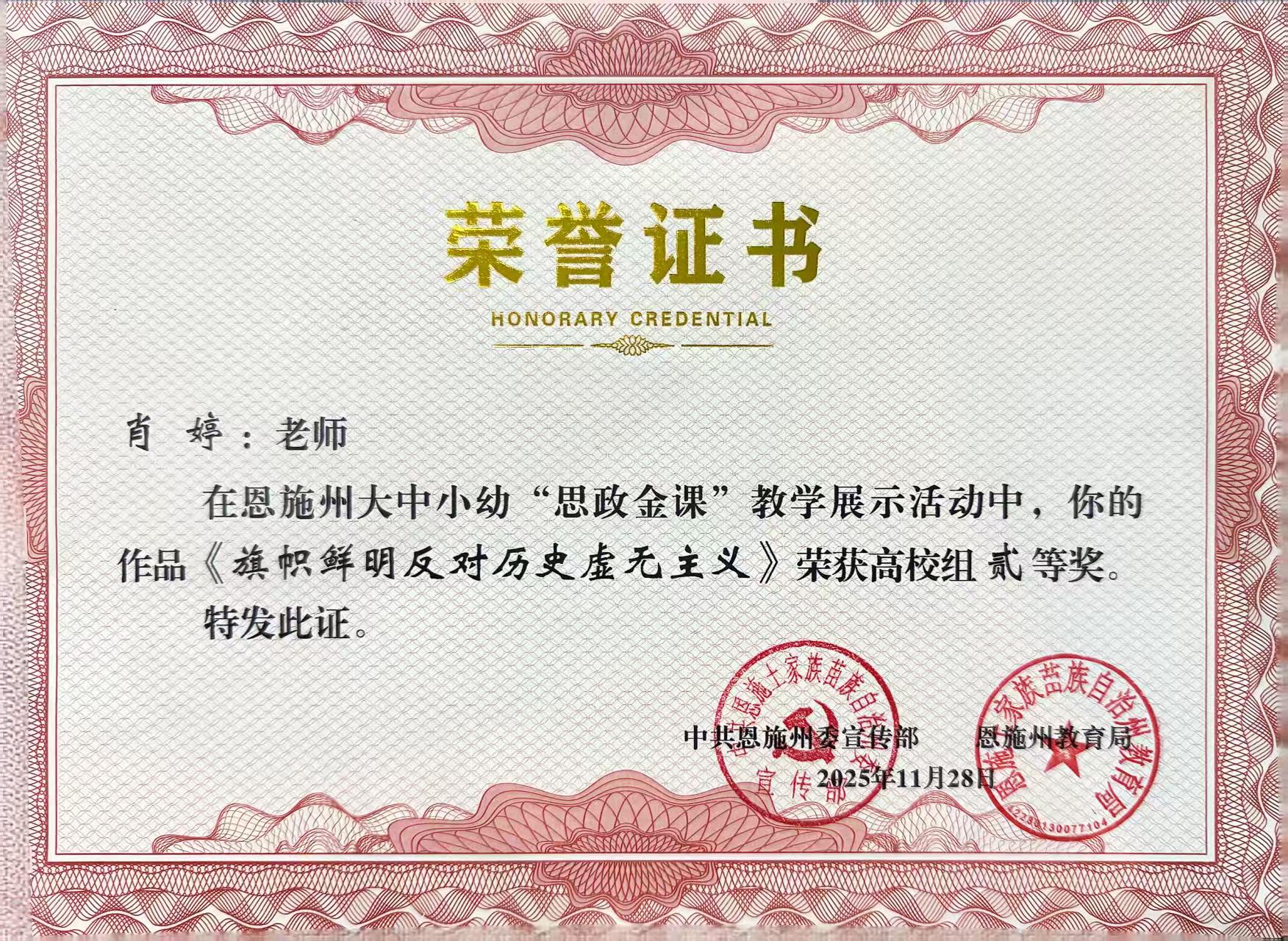 近日,中共恩施州委宣传部、恩施州教育局主办的恩施州大中小幼 “思政金课” 教学展示活动评选结果公示,湖北恩施学院 4 位教师的思政课作品在此次活动中脱颖而出,收获多项荣誉。此次 “思政金课” 教学展示活动,旨在深入贯彻落实习近平总书记关于教育的重要论述,全面推进恩施州大中小幼思想政治教育一体化建设,构建学段衔接、螺旋上升、同向同行的思政育人格局,切实提升铸魂育人实效。活动经湖北民族大学马克思主义学院、恩施州教科院组织专家评审,共评出 5 个学段 10 个学科 “思政金课” 149 节,涵盖一等奖 31 件、二等奖 59 件、三等奖 59 件。湖北恩施学院教师在此次评选中表现亮眼:
