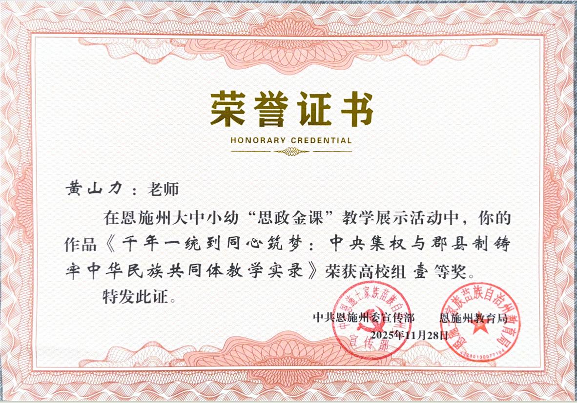 教师黄山力的作品《千秋一统到同心筑梦:中央集权与郡县制教学中中华民族共同体教学实录》,荣获高校段一等奖