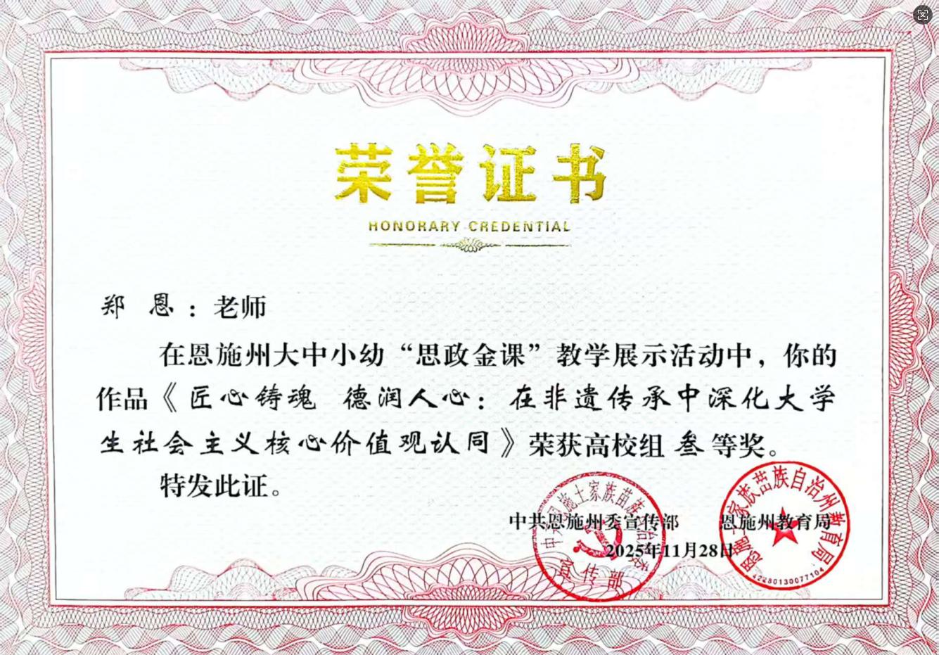 教师郑恩的《匠心铸魂 润化人心:在非遗传承中深化大学生社会主义核心价值观认同》,荣获高校段三等奖