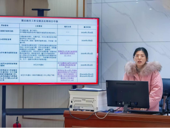 在期末总结环节,学院各职能负责人先后就分管工作汇报部署,形成“全员参与、协同推进”的工作格局:王信子主任从物资采购优化、年会筹备细节等行政保障工作展开说明;教研室主任董艳平、丁玲聚焦教学核心,明确2025年秋季教学材料归档要求、2026年春季课程集体备课计划,同时传达“2025-2026学年教学成果奖培育”“湖北省民办高校思政课建设特色案例征集”等重点任务;教学秘书韦懿芯则解读下学期排课安排,确保教学工作衔接顺畅。